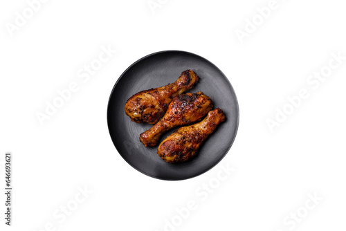 Obraz premium Delicious ruddy grilled chicken legs with spices and herbs