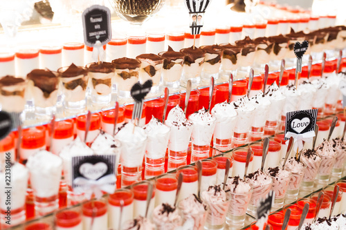Fototapeta premium Delicious sweets on wedding candy buffet with desserts, cupcakes