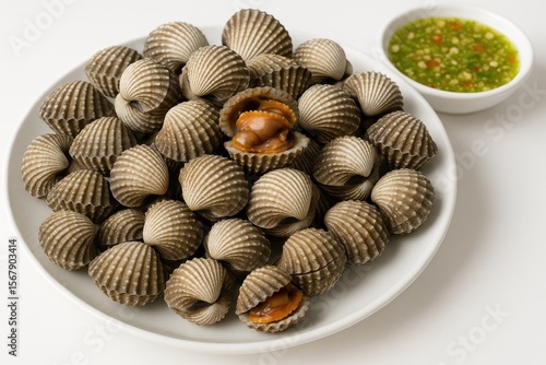 Fototapeta premium Delicious Thai-style seafood dishes featuring grilled cockles with savory sauce