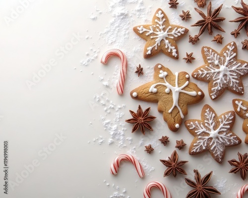 Fototapeta premium Deliciously decorated gingerbread cookies shaped like snowflakes and other festive designs arranged beautifully with candy canes and star anise on a light background