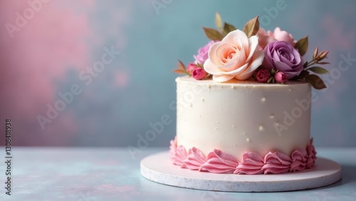 Fototapeta premium Deliciously decorated single-tiered cake adorned with delicate sugar roses and pink frosting swirls