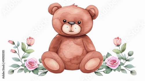 Obraz premium Delight in this charming teddy bear surrounded by blooms, expertly crafted in a beautiful watercolor style. Heartwarming and sweet