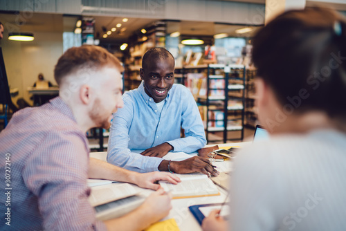 © BullRun, Obraz premium Delighted friends doing homework in library
