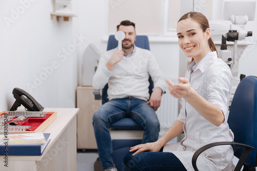 © Viacheslav Yakobchuk, Fototapeta premium Delighted happy ophthalmologist pointing at the eye chart
