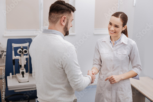 © Viacheslav Yakobchuk, Fototapeta premium Delighted pleasant doctor and patient greeting each other
