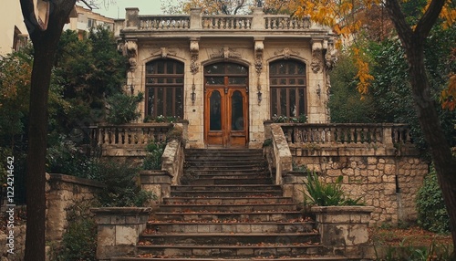 © Kelvin, Obraz premium delightful architectural composition featuring elegant windows and doors, nestled among ancient stone walls, with urban trees adding a touch of nature