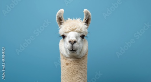 © AImmersive Imagery, Fototapeta premium Delightful cartoon alpaca head against flat blue backdrop