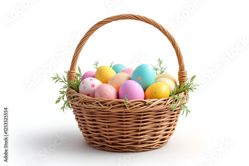 © Pitohui, Naklejka premium Delightful Easter egg basket overflowing with pastel colored eggs and adorned with green foliage on a pristine white background celebrating springtime
