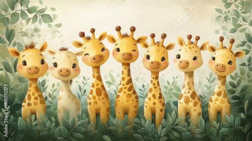 © Artajar, Naklejka premium Delightful giraffe family gathering amidst lush greenery showcasing whimsical charm and artistic watercolor rendering for joyful illustration ideal for kids