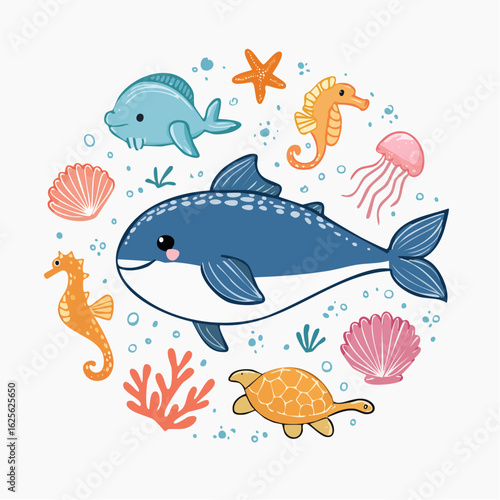 © Fir, Naklejka premium Delightful marine life illustration showcasing adorable ocean creatures in a whimsical design