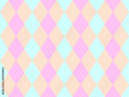 © Olena, Fototapeta premium Delightful pastel argyle pattern. Soft pink, peach, and light blue diamonds create a cheerful, versatile background ideal for websites, presentations, or branding.