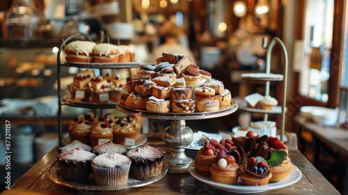 © PalaG, Naklejka premium Delightful Spread of Pastries and Cakes on Vintage Cafe Table