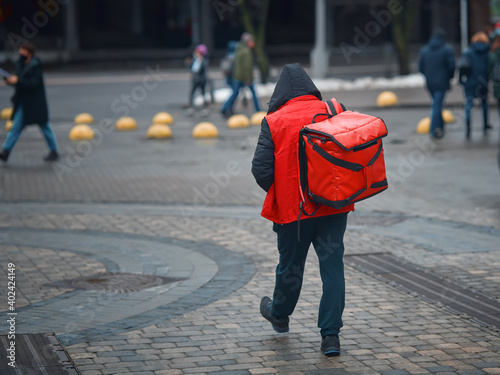 © Tricky Shark, Obraz premium Delivery boy delivering online food orders to costumers, walking with red backpack, grocery delivery. Courier carries bag with fresh food. Delivering food at doorstep in holidays from restaurant