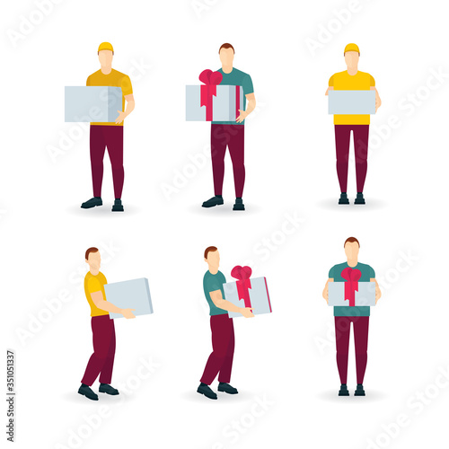 Obraz premium Delivery concept. Delivery boy characters set in different poses with various packages. Couriers with large white and gift boxes. Part of set.