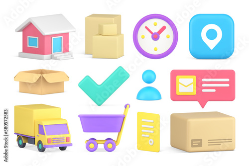 Obraz premium Delivery 3d icon set commercial cargo shipment online shopping postal courier transportation vector
