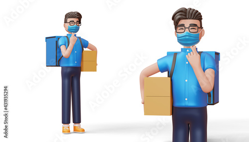 Obraz premium Delivery man doing mini heart with hands and hold a parcel box, 3d rendering.
