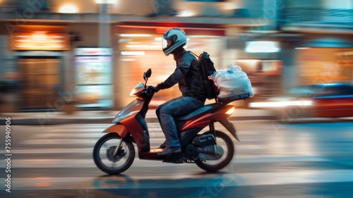 Fototapeta premium Delivery man on scooter in motion blur - An urban delivery man rides a scooter swiftly through the city streets, captured with motion blur effect