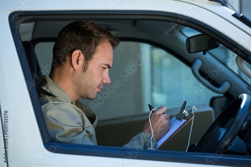 © WavebreakmediaMicro, Obraz premium Delivery man sitting in his van
