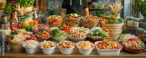 © LittleBird919, Fototapeta premium Delivery Man with Package Standing by Wooden Table in Modern Indoor Setting for E-Commerce and Logistics Use