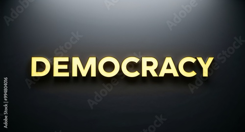 © Erlinda, Fototapeta premium democracy word lettering with yellow glow on plain black dark background