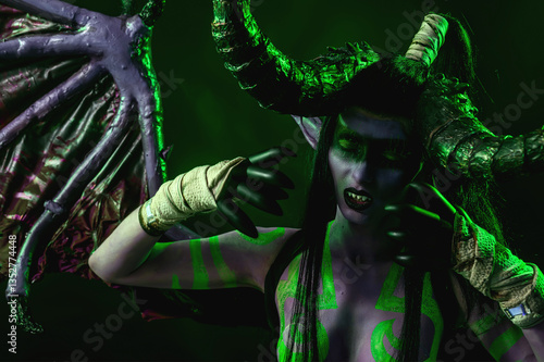 © Наталья Новикова, Fototapeta premium Demon Hunter Demon Cosplay on Black Background in Green Light