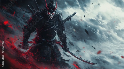 Fototapeta premium Demonic Samurai Warrior Stands Poised in Stormy Chaotic Backdrop,Katana...