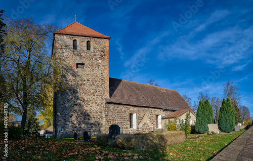 Fototapeta premium Denkmalgeschützte Dorfkirche Weesow mit ihrem massiven Westturm (Blick von...