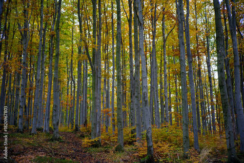 Fototapeta premium Dense autumn beech forest with tall straight trunks and yellow foliage