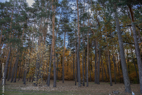 © HannaBg, Obraz premium dense autumn forest and blue sky