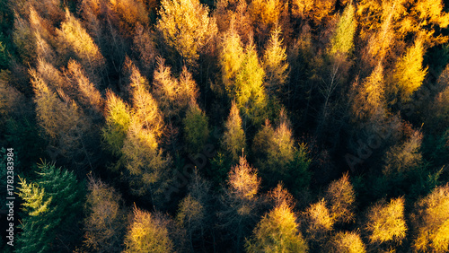 © YARphotographer, Fototapeta premium Dense Autumn Golden Larch Forest Aerial Top Down View Colorful Fall Trees