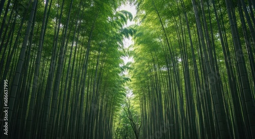 © Bejo Studio, Fototapeta premium Dense bamboo forest rising to a bright clearing, perspective shot upward