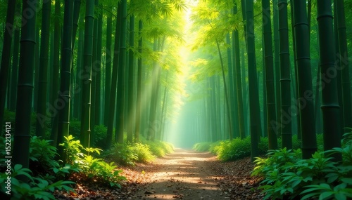 Obraz premium Dense bamboo forest, sunlight filtering through leaves, creating dappled...