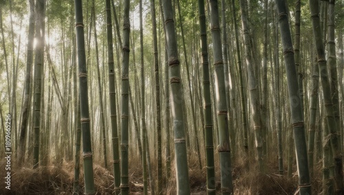 Fototapeta premium Dense Bamboo Forest with Sunlight Filtering Through the Trees.