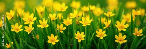 © Kingphet, Fototapeta premium Dense bouquet of bright yellow flowers among emerald green leaves, sprouts, spring, arrangement