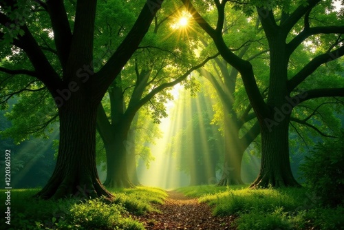 © Anulak, Fototapeta premium Dense canopy of towering oak trees with filtered sunlight, trees, wilderness