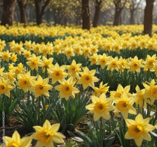 Fototapeta premium Dense cluster of glistening daffodils, sunny yellow petals, full bloom ,...