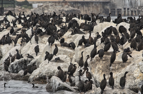 © BlueFrame One, Fototapeta premium Dense Cormorant Colony Guano Rocks Harbor Pier Monterey