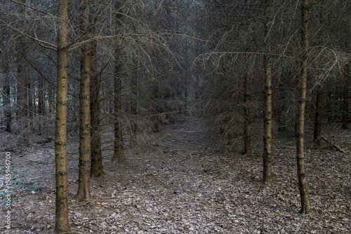 Naklejka premium Dense dried out fir trees in a forest. Moody gray scene, low natural ambient...
