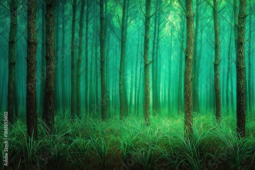 Fototapeta premium Dense emerald forest, tall trees, misty and verdant