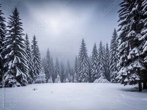 Naklejka premium Dense evergreen forest covered in fresh snow under a moody, overcast winter...