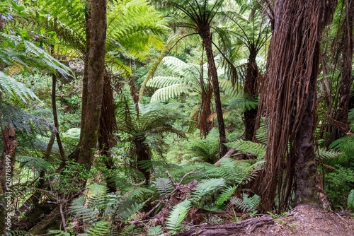 © Zenstratus, Fototapeta premium Dense fern forest with towering trees. Lush greenery and intricate root systems. Nature's beauty. , Lake Waikaremoana Track, Hawkes Bay, New Zealand