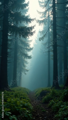 Naklejka premium Dense fir forest in misty morning, soft light filters through trees ,...