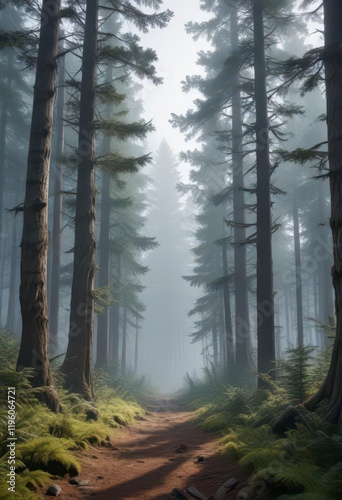 Obraz premium Dense fir forest with misty atmosphere amidst ancient trees, forest, retro,...