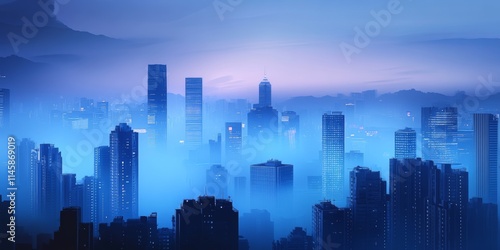 Obraz premium Dense fog completely envelops a modern city skyline creating a captivating...