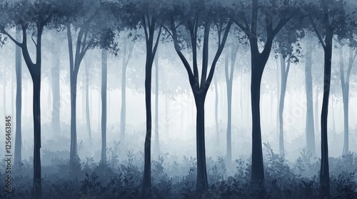 Naklejka premium Dense fog covering a tranquil forest with tall trees and lush greenery in a...