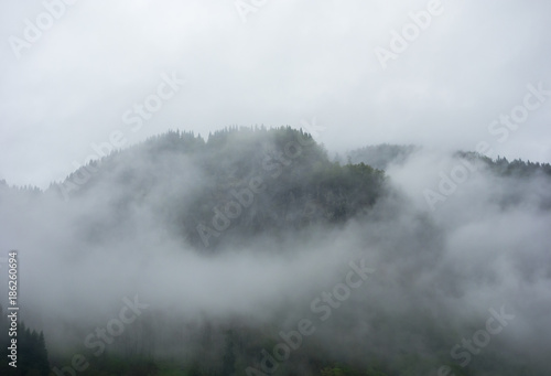 Fototapeta premium Dense fog covering mountain in Norway.