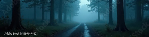 Fototapeta premium Dense fog hangs heavy, obscuring path through dark woods , branches, vibes,...