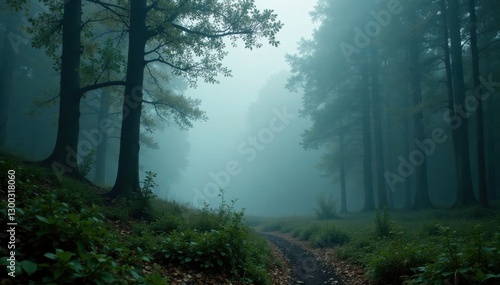 Obraz premium Dense fog hangs low, obscuring ancient woodland, gloom, silent