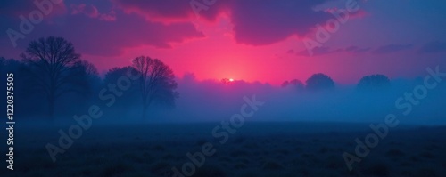 © boxs, Fototapeta premium Dense fog rolls in with blue red smoke on a dark landscape, twilight, mystery