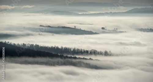 © Gorart, Obraz premium Dense fog swept through the forest. Autumn morning on the mountain.